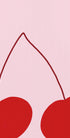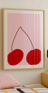 Een speels en levendig minimalistisch kunstwerk met twee opvallende rode kersen op een zachtroze achtergrond. Met een pop-artstijl en strakke lijnen voegt het stuk een moderne en frisse adem toe aan het interieur, perfect voor keuken, eetkamers en hedendaagse kunst aan de muur.