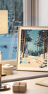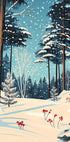 Een vredige winterillustratie van een besneeuwd bos met hoge pijnbomen en vallende sneeuwvlokken. Rode bessen geven een feestelijk tintje aan het rustige landschap, perfect voor kerst- en winterdecoraties.
