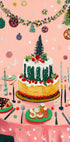Dit kleurrijke kerstmotief toont een feestelijke dukatentafel met een grote, fantasierijke taart in het midden. De taart is versierd met groene, witte en rode bessen en een klein kerstboompje erop. Rond de tafel staan borden gevuld met divers lekkers, kaarsen in diverse kleuren en kleine details die bijdragen aan een warme en speelse sfeer. De achtergrond is roze en versierd met hangende kerstballen, slingers en sterren, wat een levendige en vrolijke sfeer creëert die de magie van Kerstmis vastlegt.