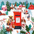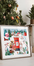 Een poëtische kerstillustratie van Caroline Bonne Müller: In een besneeuwd dorpsgebied post een vrolijke hond met rendiergewei en tas zijn kerstgroeten in de rode brievenbus. Sneeuwvlokken vallen over huizen en dennenbomen en het tafereel straalt humor, warmte en verwachting uit – perfect voor de kinderkamer en een gezellige wintersfeer.