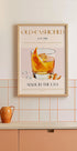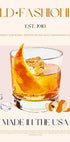 Een retro-geïnspireerde poster van een ouderwetse cocktail met een whiskyglas, sinaasappelschil en ijsblokjes. Met opvallende typografie en vintage design viert dit kunstwerk de tijdloze Amerikaanse cocktail. Perfect als keukendecoratie, barposter of voor de thuisbar.