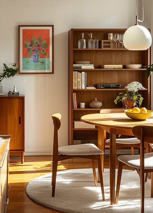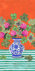 Een kleurrijk stillevenkunstwerk met een blauwe porseleinen vaas gevuld met roze bloemen en groene klavers, tegen een sterke oranje achtergrond. Het gestreepte tafelkleed zorgt voor een speels contrast, waardoor dit exemplaar een levendig decoratief statement wordt. Perfect voor liefhebbers van zowel botanische als moderne kunst.
