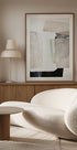 Een minimalistische abstracte poster van Dan Hobday met zachte lagen penseelstreken in neutrale tinten. De gestructureerde vormen creëren een evenwichtige en moderne compositie, perfect voor moderne interieurs, Scandinavisch design of als onderdeel van een rustgevende fotowand.