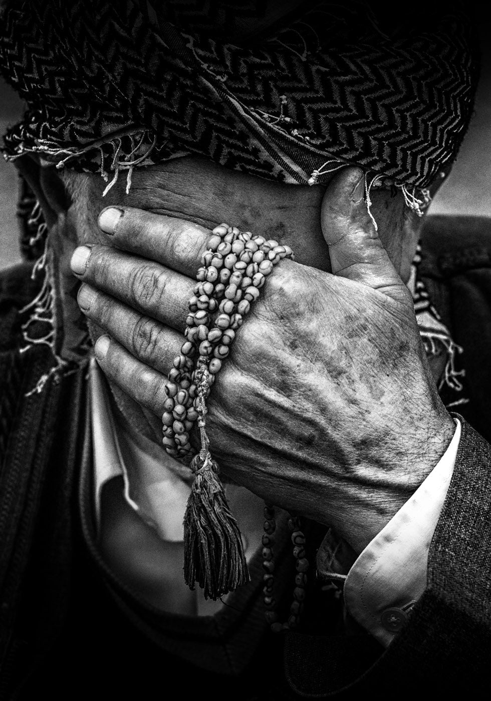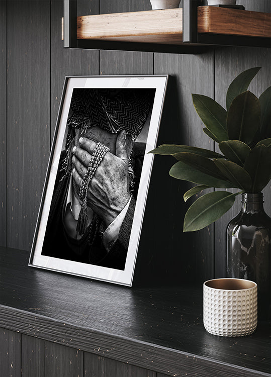 Een krachtig zwart-witportret dat de diepe emoties van een oudere Koerdische man vastlegt. Zijn verweerde handen, versierd met gebedskralen, bedekken delen van zijn gezicht en drukken bedachtzaamheid, kracht en cultureel erfgoed uit. Een aangrijpende foto die rauwe emotie en traditie in elk interieur brengt.