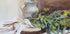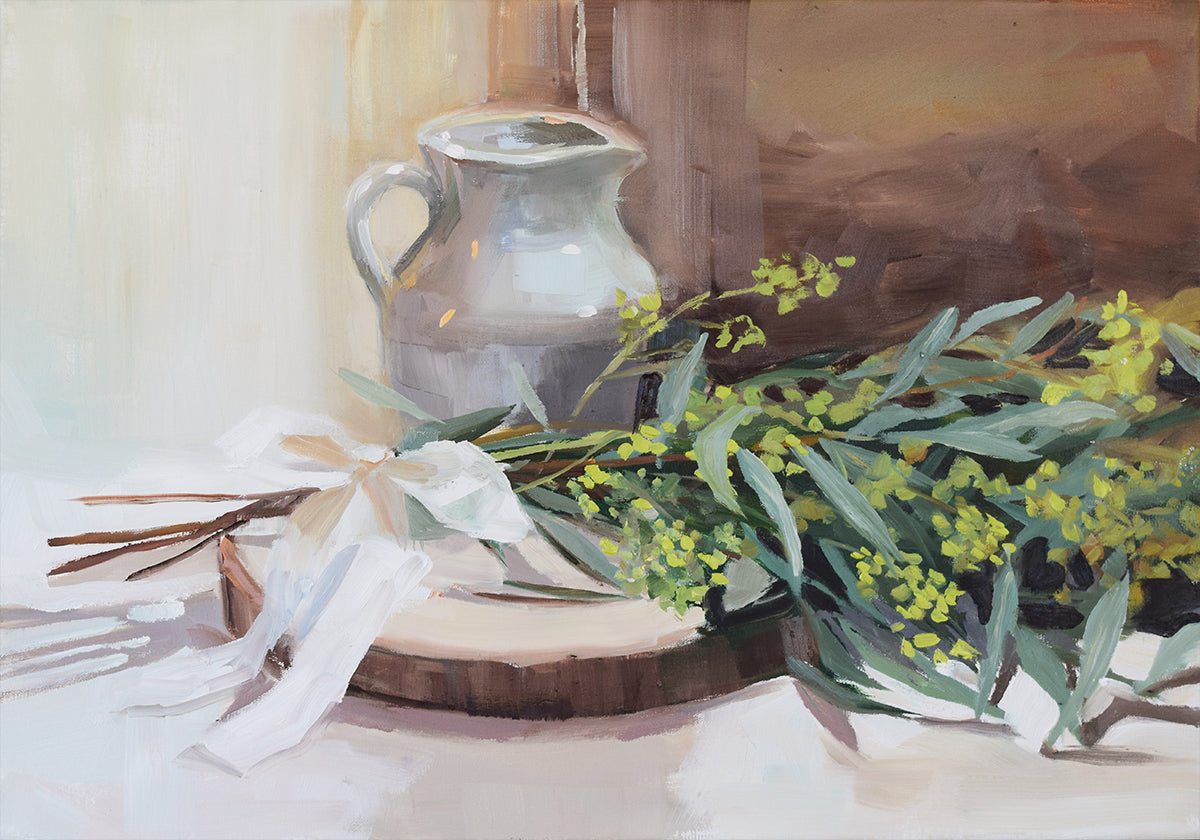 Een charmant stilleven van een rustieke kan met delicate bladeren en gele bloemen ernaast. Het kunstwerk vangt een warme, tijdloze sfeer op met zijn schilderkunstige penseelstreken, gedempte tinten en zachte contrasten. Perfect om een gezellige, vintage-geïnspireerde sfeer te creëren.