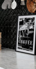 Een opvallende zwart-wit poster met het woord "COFFEE" gecombineerd met een close-up van een espressomachine die verse koffie in een kopje giet. Dit minimalistische typografische ontwerp is perfect voor keukenmuren, koffiebars of cafés en combineert inspiratie met een stijlvolle monochrome esthetiek.
