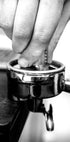 Een opvallende zwart-witte koffieposter met een close-up van de hand van een barista die versgemalen koffie in een portafilter drukt. Dit minimalistische monochrome ontwerp is perfect voor koffieliefhebbers, cafés en keukenmuren en weerspiegelt het ambacht van het espresso zetten.
