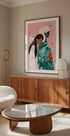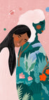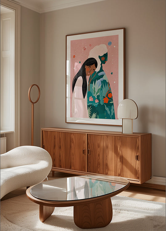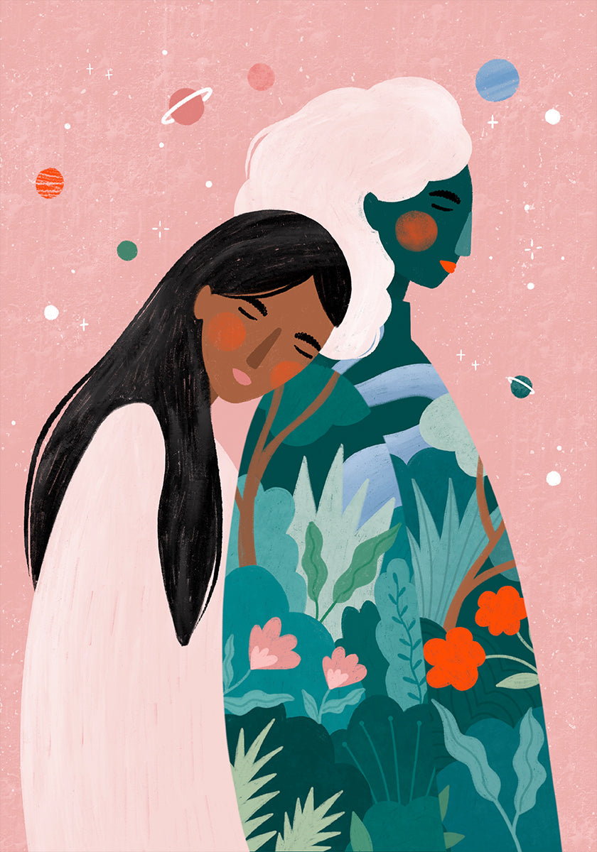 Een symbolische en moderne illustratie van twee vrouwen omringd door kosmische elementen en weelderige natuur. Het kunstwerk geeft uitdrukking aan thema’s als bescherming, moederschap, vriendschap en harmonie tussen mens en natuur.