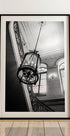 Een tijdloze zwart-witfoto die de elegantie van een Parijse interieur vastlegt, met een prachtige kroonluchter die boven een gebogen trap hangt. De ingewikkelde smeedijzeren elementen en architectonische details benadrukken de Franse verfijning en artistieke expressie – perfect voor liefhebbers van een klassiek Europees decor.