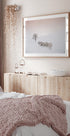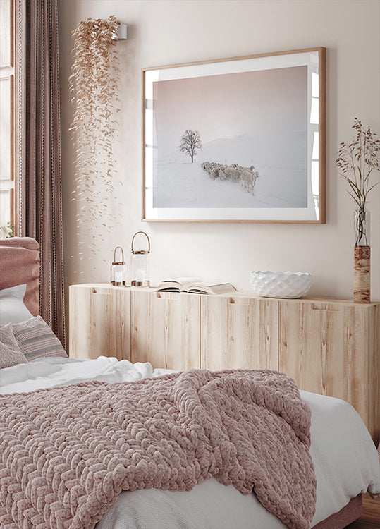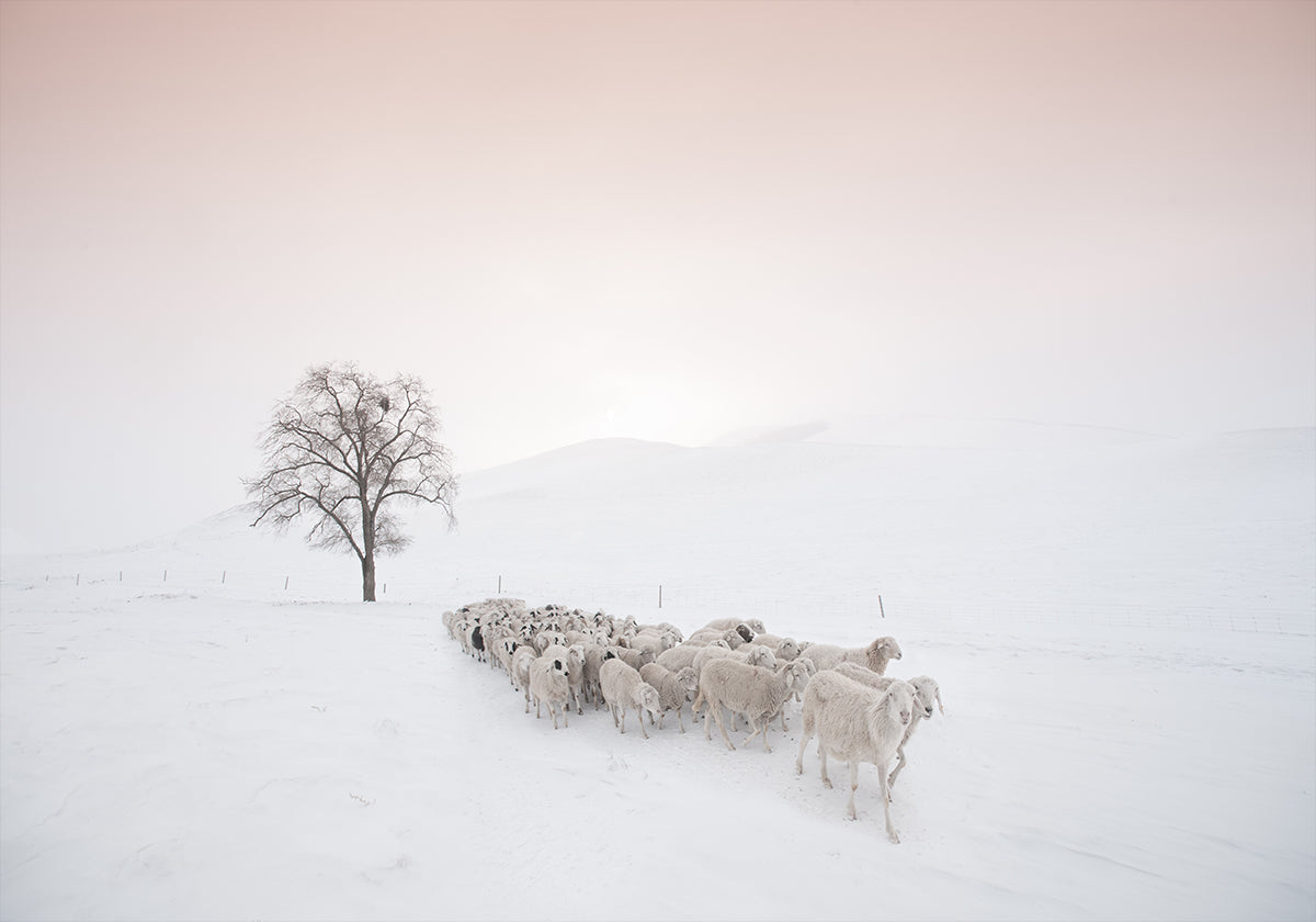 In zachte pastelkleuren ontvouwt zich een rustige winterochtend: een kudde schapen trekt door het besneeuwde landschap op zoek naar voer, terwijl een eenzaam boomsilhouet als stil baken in de kou staat. De poëtische compositie van Bingo Z legt landelijke rust, ijzige lucht en de delicate roze lucht vast.