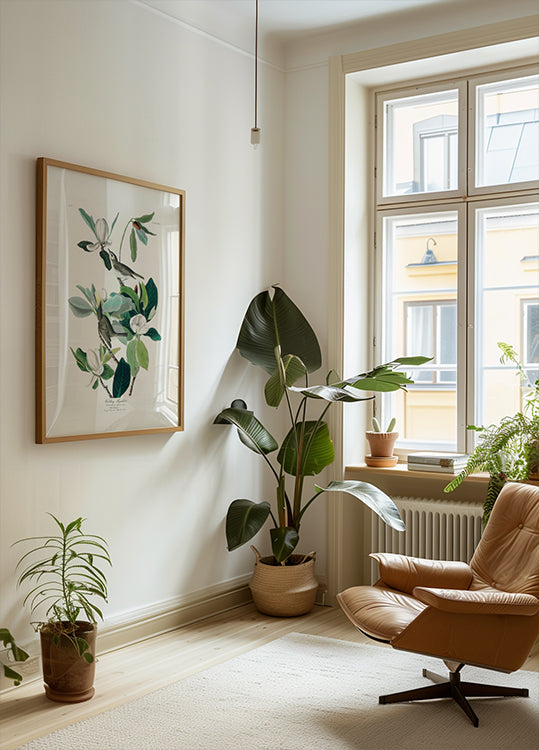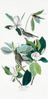 Vintage botanische kunst met magnoliabloemen en gedetailleerde afbeeldingen van vogels. Een elegante en ingewikkelde natuurillustratie die levendig gebladerte in een delicate compositie benadrukt. Perfect voor liefhebbers van klassieke botanische prints en natuurhistorische kunst.