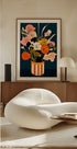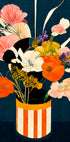 Een levendig boeket bloemen in een speels gestreepte vaas tegen een donkere achtergrond, met klaprozen en delicate bloemen. Dit kunstwerk benadrukt het hedendaagse bloemdessin met rijke kleurcontrasten, perfect als inspiratie voor een moderne woninginrichting.