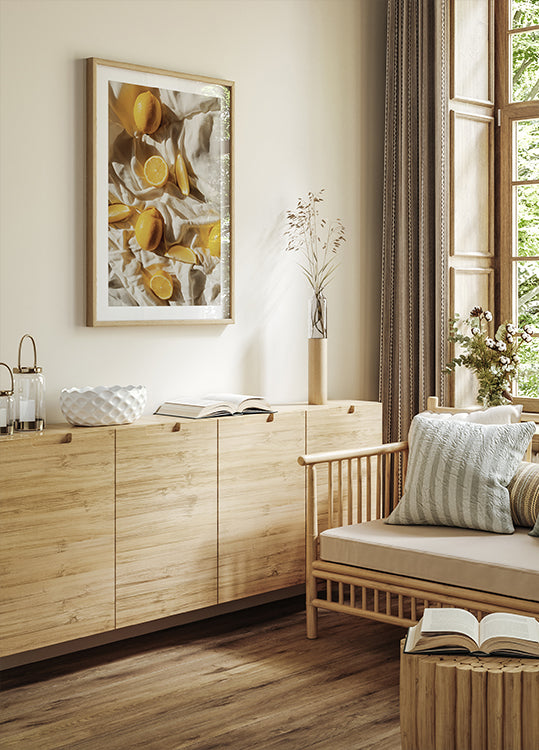Een artistiek stilleven van felgele citroenen, waarvan sommige in plakjes, prachtig gerangschikt op een getextureerde witte stof. Het zonlicht stroomt naar binnen en werpt dynamische schaduwen die het contrast tussen de zachte stof en de glanzende citroenschillen benadrukken. Perfect voor het creëren van een frisse, verkwikkende sfeer in een keuken of eetkamer.