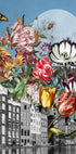 De poster van Marja van den Hurk verenigt schitterende tulpen en fijne vlinders in een fantasierijke collage boven de Amsterdamse grachten. Klassieke puntgevelhuizen, maanlicht en poëtische details creëren een speelse, retro-surrealistische sfeer, waar natuur en stad in kleurrijke, dromerige harmonie samenvloeien. Een eerbetoon aan Nederland, tulpen en de lichtheid van de zomer.