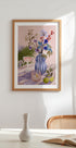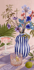 Dit levendige stillevenkunstwerk bestaat uit een gestreepte vaas met kleurrijke bloemen, omgeven door tropische bladeren en glas op een gestructureerd oppervlak. De compositie creëert een harmonieuze mix van natuur en moderne esthetiek en voegt zowel frisheid als elegantie toe aan elke kamer.