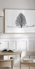 LONELY TREE af Martin Froyda indfanger stilheden i et sort-hvidt vinterlandskab: en enkelt, frostdækket træsilhuet står alene i blød tåge foran fjerne bjergkonturer. Den høje nøglelysstemning og det rene, hvide rum skaber poesi af isolation, ro og eftertanke i et tidløst udtryk. Et motiv, der taler til minimalisme og nordisk ro.