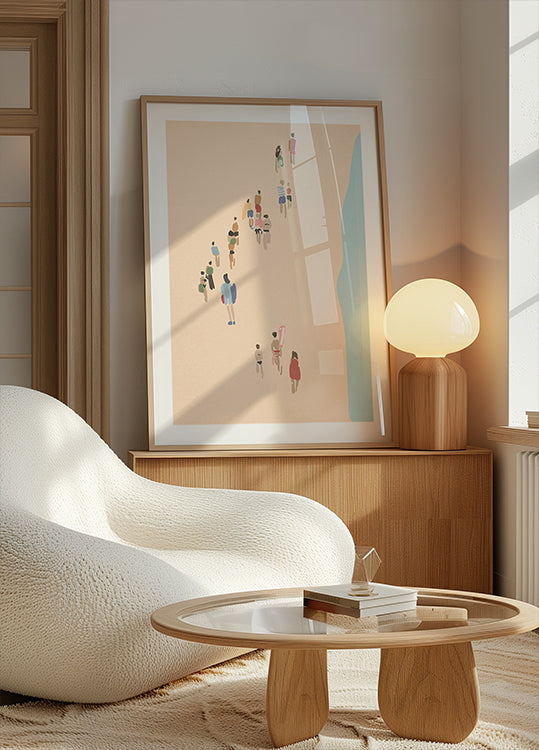 Een eenvoudige en vredige illustratie van strandgangers die richting zee lopen, geschilderd in zachte pastelkleuren. Perfect voor het creëren van een lichte en ontspannen sfeer in zomerhuizen of strandhuisjes.