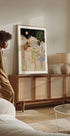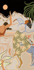 Maanverlichte dansposter legt een moment van pure vreugde en vrijheid vast terwijl twee vrouwen gracieus bewegen onder de warme gloed van een volle maan. Met een dromerig palet van aardse beige tinten, diepzwart en weelderig groen verenigt de natuur zich met de expressieve menselijke vorm. Losse, schilderkunstige lijnen en getextureerde schakeringen geven het werk een dynamische, bijna etherische kwaliteit. Vloeiende stoffen met strepen en bladpatronen bewegen mee met beweging, terwijl omringende planten en een klassieke urn elegantie toevoegen. Dit kunstwerk straalt een zorgeloze sfeer uit en dient als indrukwekkend middelpunt in bohemien, moderne of op de natuur geïnspireerde interieurs.