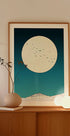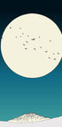 Moonlit Ascent van Nicholas toont een rustige nacht waarin een volle maan boven besneeuwde bergsilhouetten uitsteekt. Diepblauwe tinten vormen een zacht verloop naar de horizon terwijl vogels stilletjes voorbij glijden. De eenvoudige, grafische expressie en de heldere lijnen creëren een dromerige, meditatieve sfeer. Een minimalistisch nachtlandschap met contrasterende sneeuwmaan en bergtoppen.