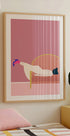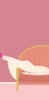 Een charmante en speelse illustratie van een vrouw die ondersteboven op een vintage bank ligt, met speelse patronen en kleurrijke hakken. Het opvallende roze kleurenpalet en het minimalistische ontwerp voegen een gevoel voor humor en moderne charme toe, waardoor dit het perfecte statement-stuk is voor slaapkamers, woonkamers of creatieve ruimtes.