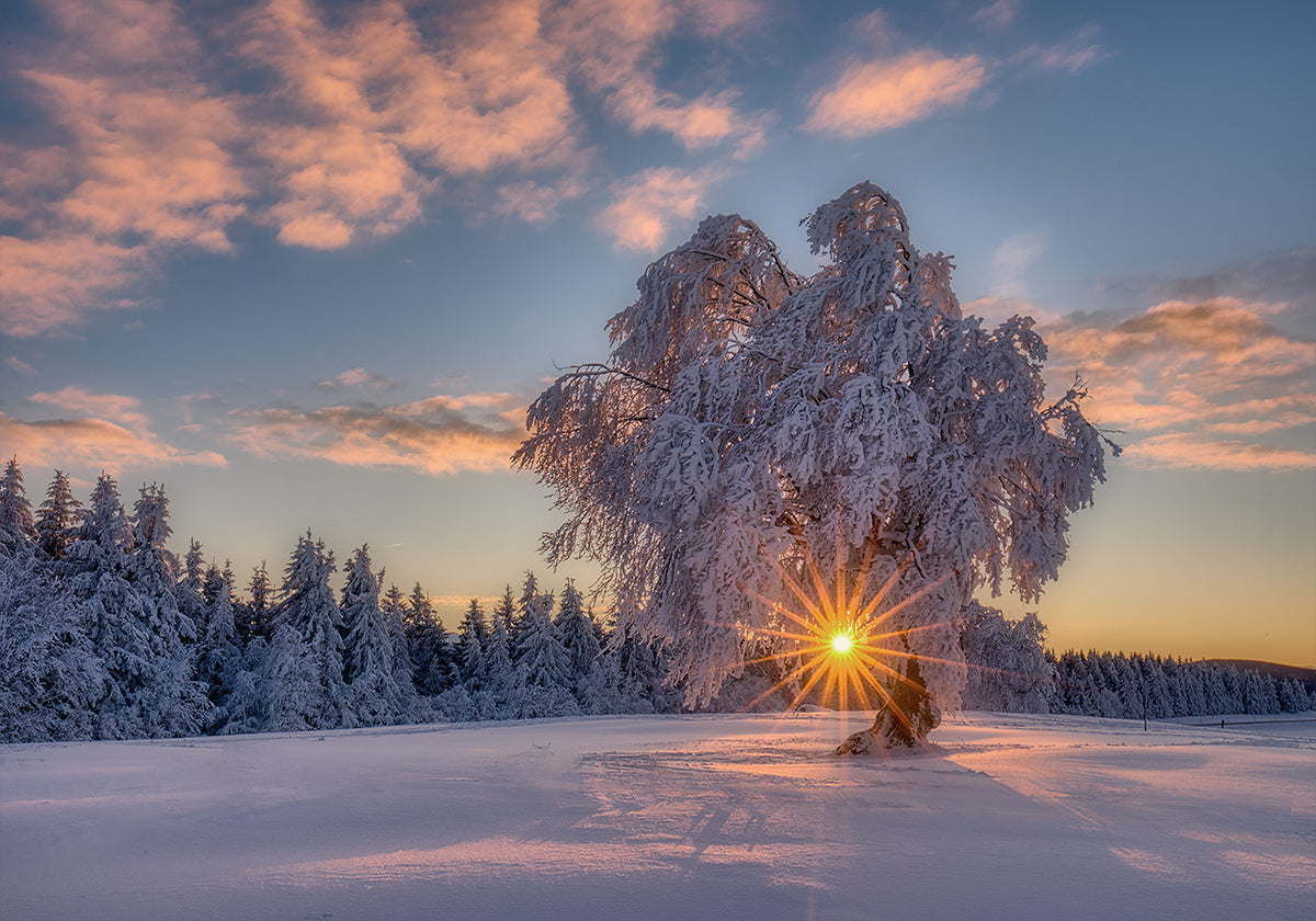 Een ijskoude winterochtend op het Schauinsland: de zon breekt als een ochtendster door de met vorst bedekte kroon, werpt lange schaduwen over het witte landschap en kleurt de lucht in koele blauwe tinten. Judith Kuhn legt stille natuurpoëzie vast, waar kou, licht en kalmte samenkomen in een tijdloos wintermotief. Een eyecatcher voor in huis en een rustpauze voor het oog.
