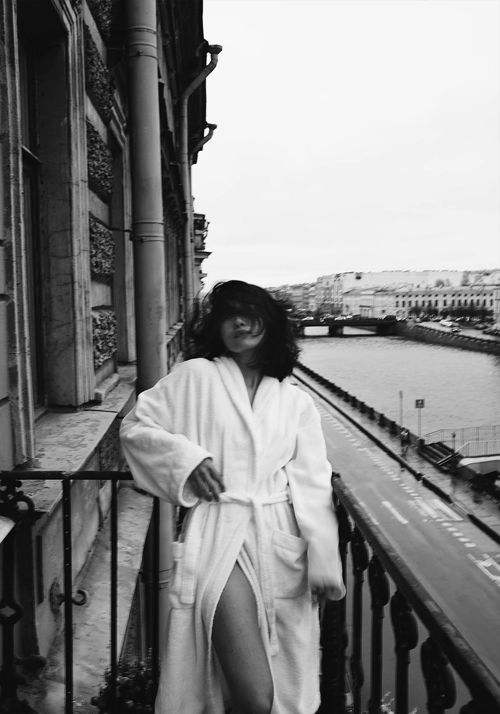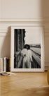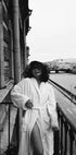 Een stijlvolle zwart-witfoto die de elegantie van een ochtendmoment op een balkon in Parijse stijl vastlegt. De figuur in badjas straalt ongedwongen stijl en intimiteit uit, met de stad en de rivier als rustige achtergrond. Perfecte muurkunst voor liefhebbers van mode, fotografie en tijdloze stedelijke esthetiek.