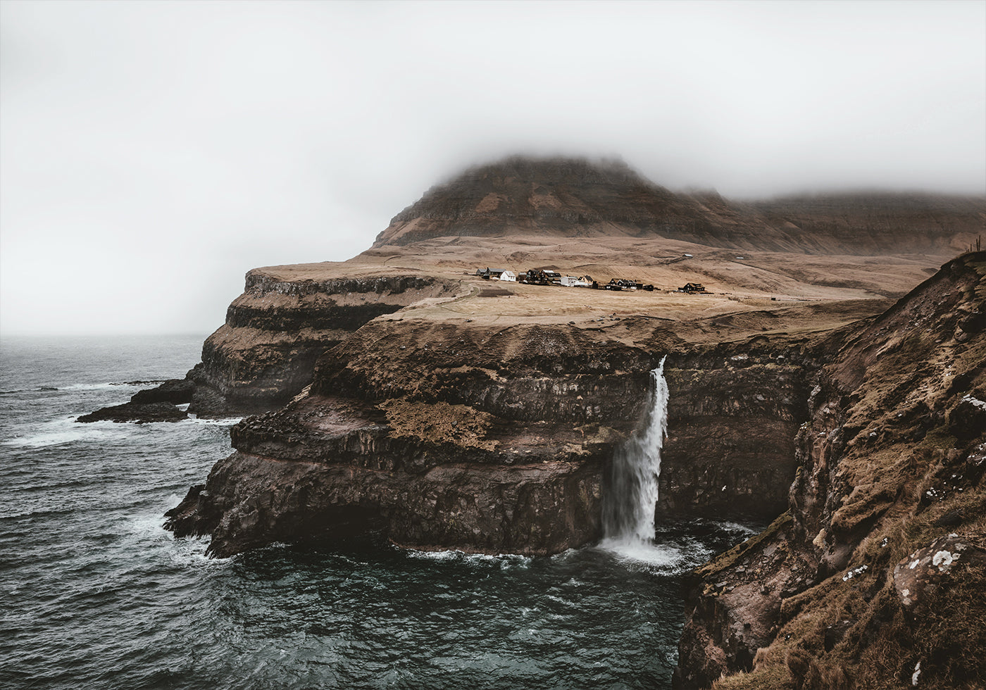 De iconische Múlafossur-waterval stort zich sierlijk in de Atlantische Oceaan, omgeven door indrukwekkende kliffen en een charmant dorpje op een winderig plateau op de Faeröer. Laaghangende wolken bedekken de bergen en dragen bij aan de betoverende schoonheid van deze afgelegen locatie.