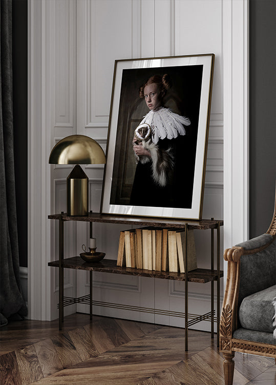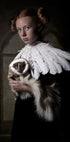 Dit suggestieve portret van de Nederlandse kunstenaar Carola Kayen-Mouthaan toont een beheerste jonge vrouw in een vintage, middeleeuws getinte jurk, gevlochten haar en een kraag met veren, die het frame deelt met een zacht stinkdier. Dramatische, nostalgische verlichting en verfijnde texturen geven ouderwetse elegantie met een speelse, sprookjesachtige twist, met echo's van renaissanceportretten.
