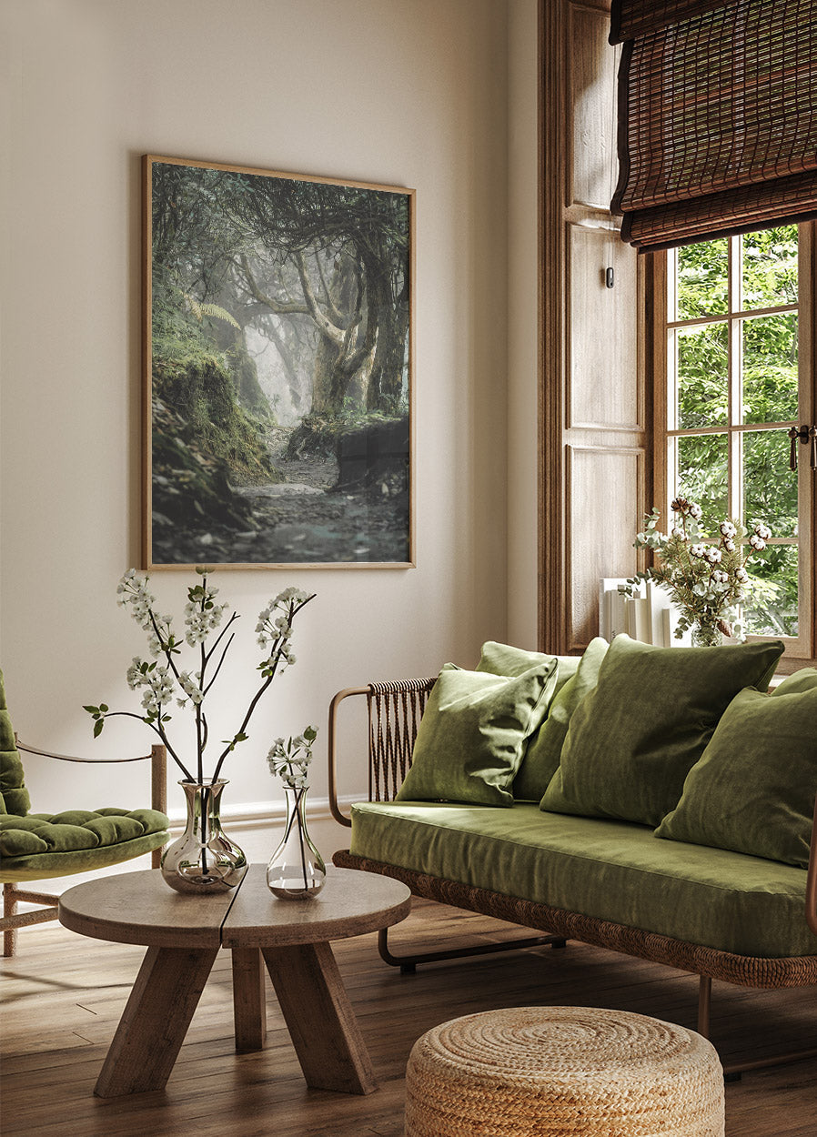 Een poster die de magische en mysterieuze sfeer van een bos vastlegt, perfect om een dromerige en sfeervolle sfeer aan elke kamer toe te voegen, ideaal voor wie van sprookjesachtige natuur houdt /span>