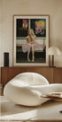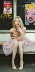 Een moderne interpretatie van klassieke pop-art, waarbij iconische motieven worden gecombineerd met een eigentijdse stijl. Een vrouw in een roze rok weerspiegelt vintage glamour tegen een achtergrond van Warhols Marilyn en Campbell's soepblikje-graffiti, waardoor een dynamische visuele fusie ontstaat.