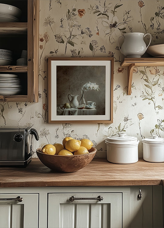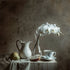 Old wall van Margareth Perfoncio toont een stilleven voor een versleten, witgekalkte muur: een tafel gedekt met een zacht tafelkleed, delicate kopjes, glazen en een heldere vaas met orchidee en peer. Gedempte, natuurlijke tinten en een zacht, schuin licht creëren rust, poëzie en tijdloze elegantie voor de keuken, woonkamer en eetkamer. Perfect voor een rustige, Scandinavische sfeer.