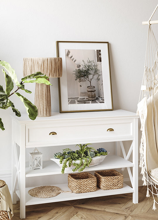 Een minimalistische en serene afbeelding van een rustieke olijfboom, geplant in een houten dienblad, geplaatst tegen een witgekalkte muur. Dit kunstwerk benadrukt de tijdloze schoonheid van de mediterrane charme en is perfect voor het creëren van een ontspannen en natuurlijke sfeer.