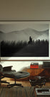 Een dramatische zwart-witfoto van een cowboy die door een kudde wilde paarden rijdt, omringd door mist en stof. Met sterke silhouetten en filmische tonen legt dit kunstwerk vrijheid, beweging en rauwe natuur vast.