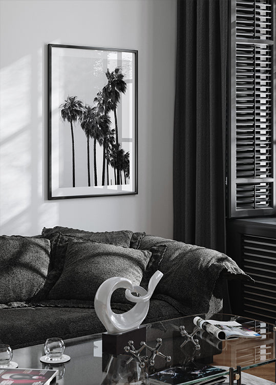 Een stijlvolle zwart-witfoto van hoge palmbomen die zwaaien in de wind. Het minimalistische en tijdloze ontwerp maakt het ideaal voor moderne interieurs en kustinterieurs.