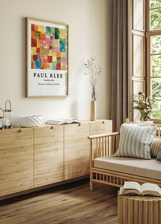 Een levendig en dynamisch kunstwerk van Paul Klee uit 1914, met een abstract mozaïek van levendige kleuren. Deze aquarel toont Klee's unieke talent voor kleurenleer en zijn kenmerkende stijl van geometrische abstractie. Het samenspel van warme en koele tinten geeft het werk een ritmisch en harmonieus gevoel, ideaal voor moderne kunstcollecties.