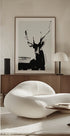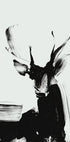 Een abstract zwart-wit portret van een hert, gemaakt met krachtige, expressieve penseelstreken. Gezicht en gewei zijn te zien in de rauwe, artistieke lijnen, die het motief een dramatische en moderne uitdrukking geven.
