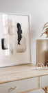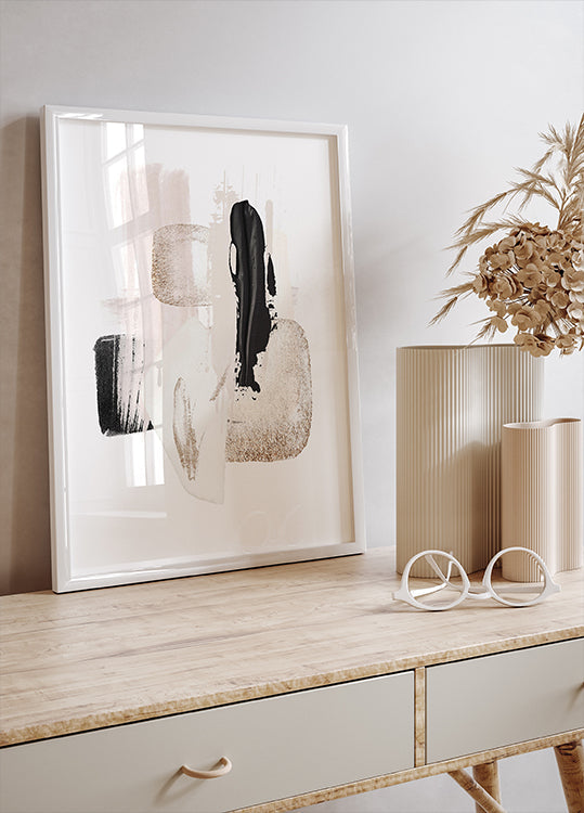 Een stijlvolle abstracte poster met getextureerde penseelstreken in de kleuren zwart, beige en goud. De moderne compositie combineert schilderkunstige texturen met minimalistische elegantie, perfect voor moderne interieurs en kunstliefhebbers.