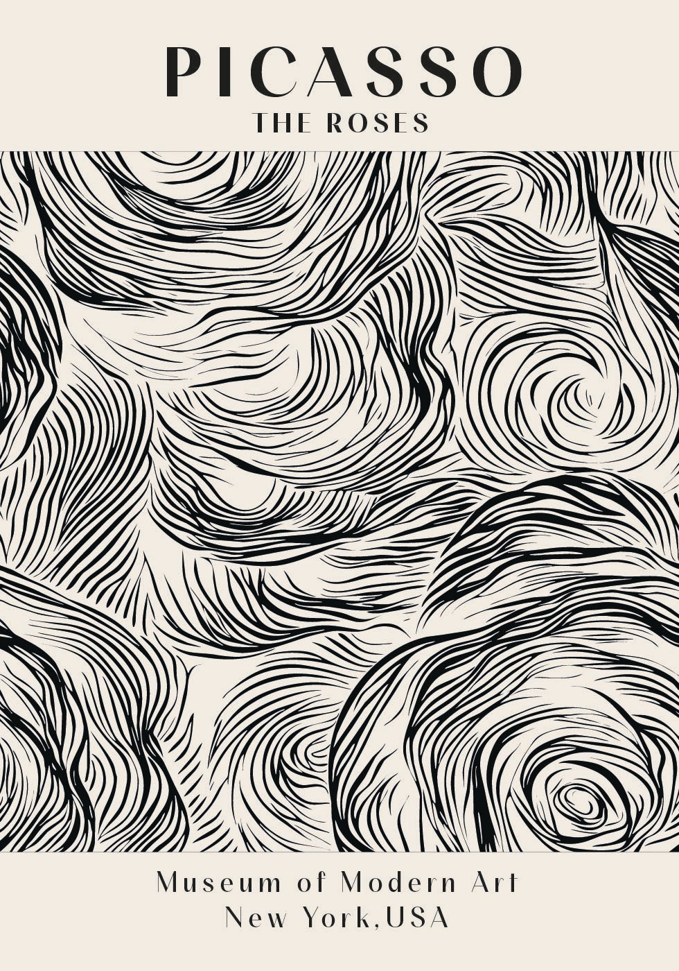 Een moderne abstracte poster, geïnspireerd door Picasso, met wervelende zwarte lijnen die een ingewikkeld rozenpatroon vormen. Het contrastrijke zwart-beige palet benadrukt de artistieke en verfijnde expressie. Een eerbetoon aan hedendaagse en abstracte kunst, perfect voor moderne interieurs en kunstliefhebbers.