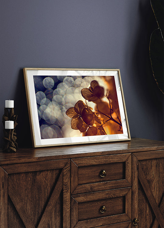 Deze betoverende macrofoto legt gedroogde hortensiabladeren vast die gloeien in warm goudkleurig licht tegen een dromerige achtergrond van cirkelvormige bokeh. De fijne nerven in de bladeren zorgen voor ingewikkelde details, terwijl de heldere sfeer elegantie, nostalgie en tijdloze botanische schoonheid uitstraalt.
