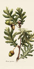Een gedetailleerde botanische illustratie van Quercus pyrenaica (Pyreense eik) met eikels en fijn gestructureerde bladeren in klassieke vintage stijl. Deze elegante plank is een eerbetoon aan de natuurlijke historie en voegt tijdloze charme toe aan het interieur. Perfect voor botanici, bosliefhebbers en traditionele illustratie.