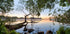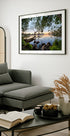 Een serene natuurprint die de stilte van een kalm meer bij zonsondergang vastlegt, omlijst door weelderige groene bomen en gladde rotsen langs de kust. De spiegelachtige weerspiegeling van de lucht en de takken creëert een vredige, dromerige compositie - perfect om een gevoel van rust toe te voegen aan slaapkamers, woonkamers of welke door de natuur geïnspireerde ruimte dan ook.