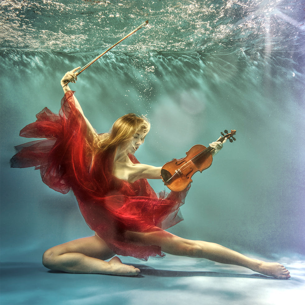 Een dromerig onderwaterportret waarin een stel in een zwembad drijft en viool speelt tussen lichtgevende bubbels en wuivende bloemen. Romantiek en muziek smelten samen in een rustige prelude die poëzie, passie en gewichtloze elegantie uitstraalt. Fotografie door Uniquecapture, gemaakt om emotie op te roepen. Perfect als centrale eyecatcher in huis.