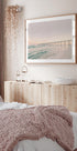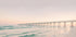 Een vredig uitzicht op de kust met een lange pier die zich uitstrekt in de zee, badend in zachte pastelkleuren bij zonsondergang. Golven en stille luchten creëren een rustige sfeer, perfect om vrede en harmonie op te roepen.