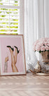 Een stoere en stijlvolle poster die een feestelijke sfeer uitstraalt met elegante benen op zwarte hoge hakken en een sprankelend glas champagne tegen een pastelroze achtergrond. De combinatie van mode, feest en disco-glamour maakt dit een perfecte statement-poster voor moderne interieurs.