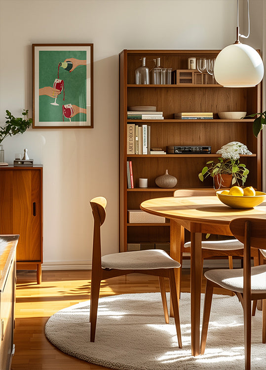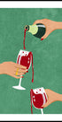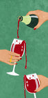 Een kleurrijke illustratie van handen die rode wijn in glazen gieten, waarbij de wijn op speelse en feestelijke wijze overstroomt. Met krachtige kleuren en stijlvolle details vangt het stuk de vreugde van bijeenkomsten, cocktails en gedeelde momenten en wordt het een chique en levendig kenmerk in moderne interieurs.