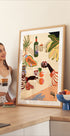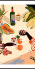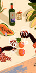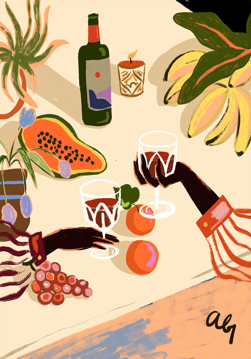 Een kleurrijke illustratie van een tropisch geïnspireerd stilleven, met handen die wijnglazen roosteren tussen vers fruit, bloemen en planten. Met krachtige kleuren en speelse details vangt het werk de warmte van het sociale leven en het bierleven en wordt het een levendig en stijlvol statement.