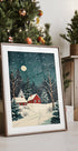 Et poetisk vintermotiv af Pictufy Studio: røde huse samler sig i sneen under en dybblå nattehimmel, hvor stjerner og måneskin kaster et stille skær over landskabet. Graner står frostklare, og varme vinduer antyder hygge indenfor—en rolig, nordisk julestemning til hjemmets vægge. Perfekt til stue, entré eller hytte.