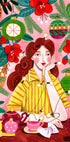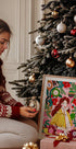 Een warm, retro kersttafereel: een glimlachende roodharige vrouw in een gestreepte blouse geniet van dampende thee naast een glinsterende kerstboom vol kerstballen en slingers. Sneeuw glinstert in het raam, kleuren in roze en dennengroen zorgen voor nostalgie. Een gezellige, op de midcentury geïnspireerde illustratie van Caroline Bonne Müller. Perfect voor winterpret.
