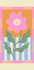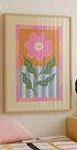 Speelse roze bloemenposter is een charmante en vrolijke bloemenillustratie met een retro-geïnspireerd design. Het toont een grote lichtroze bloem met zachte bloemblaadjes en groene bladeren, tegen een warmoranje achtergrond met blauwe en witte strepen, omlijst door een roze geblokte rand. De compositie straalt optimisme en speelsheid uit, waardoor hij perfect past in moderne, eclectische of vintage-geïnspireerde interieurs. Ideaal voor het opfleuren van keukens, slaapkamers of creatieve ruimtes, het voegt een vleugje kleur en vreugde toe aan elke fotomuur.