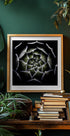 Een hypnotiserende close-up van een Sempervivum-rozet, waarbij de bladeren zich in perfecte symmetrie en diepgroene tinten ontvouwen tegen een donkere, rustige achtergrond. De geometrische ordening ontmoet organische poëzie en creëert een rustig, grafisch effect. Foto door Victor Mozqueda, ideaal voor moderne ruimtes. Het contrast benadrukt de architectuur en de rust van de plant.